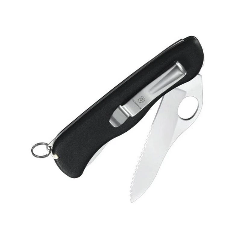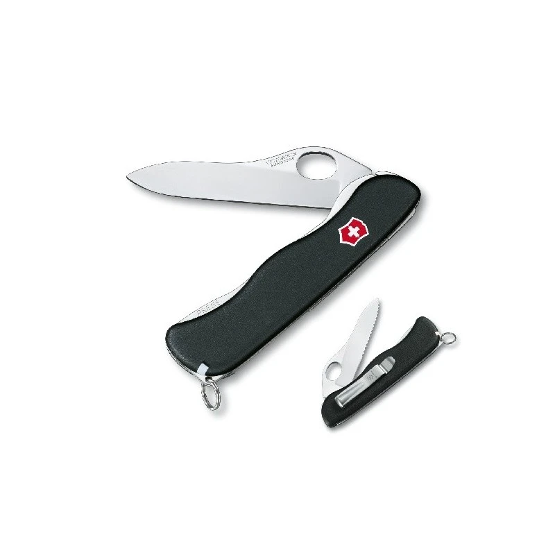 Tout le monde connaît le couteau suisse Sentinel, un modèle doté de fonctions relativement basiques. Ce Victorinox est doté exactement des mêmes fonctionnalités, à savoir une grande lame en acier inoxydable avec blocage de sécurité munie d’un trou pour l’ouverture à une main, une paire de pincettes, un cure-dents ainsi qu’un anneau en inox pour faciliter le transport (accrochage comme un porte-clés). La différence entre les deux modèles réside dans le seul fait que ce couteau suisse Sentinel est doté d’un clip ceinture au verso, qui comme son nom l’indique, permet de l’accrocher facilement à votre ceinture : il suivra le moindre de vos mouvements.